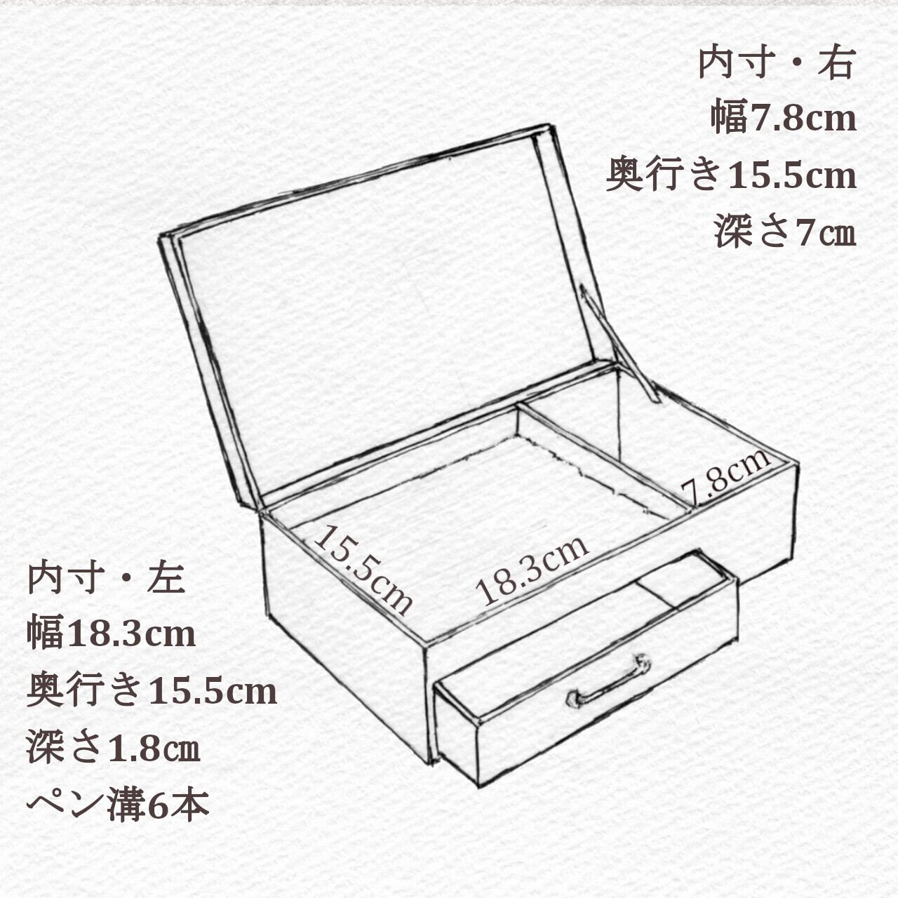 蓋を開くと6本のペンとインク、引き出しには紙雑貨などを収納することができます。