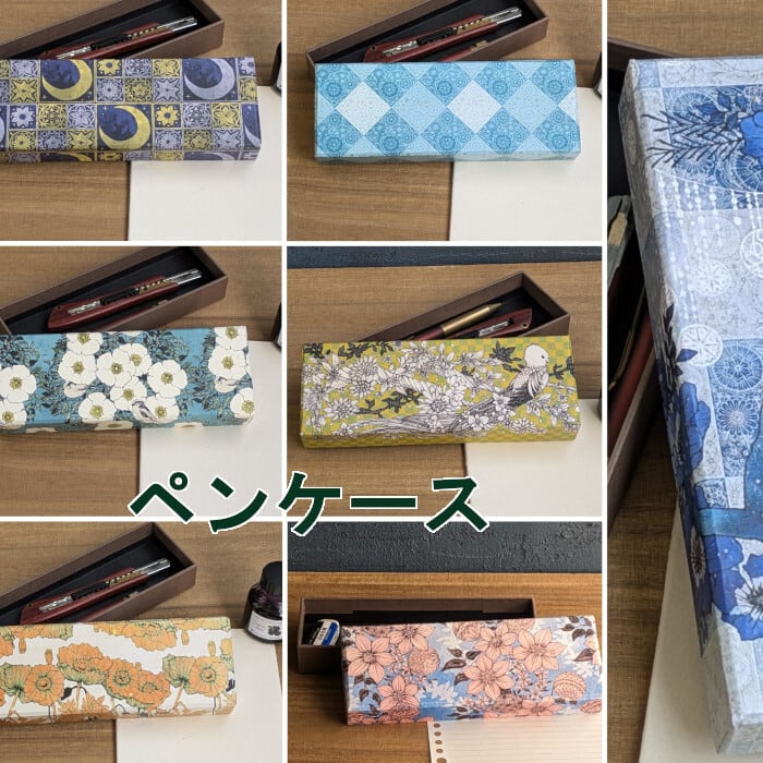 手作りの紙製ペンケース。下の箱の内側は黒、外側は茶色。蓋の内側は黒、外側は柄となっています。