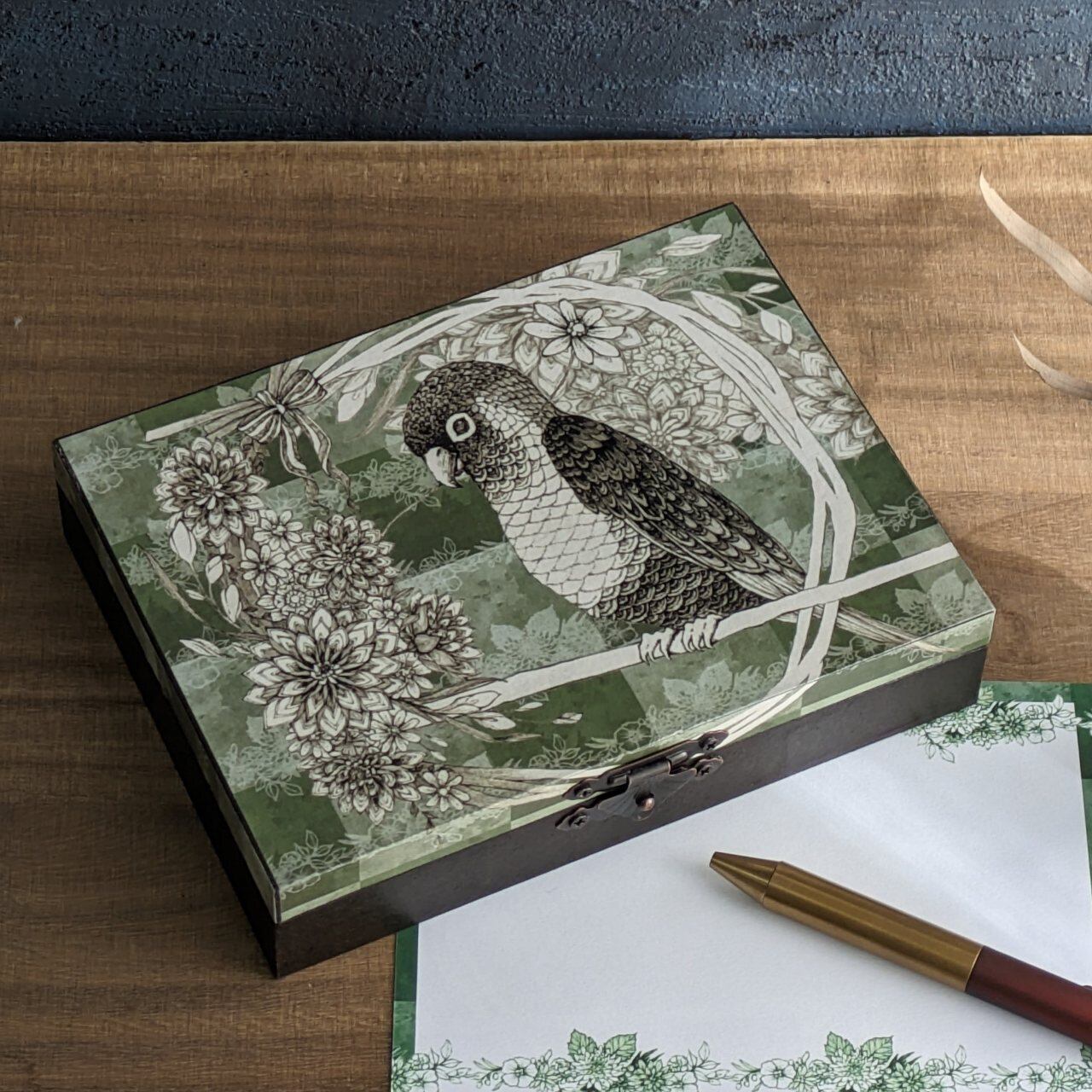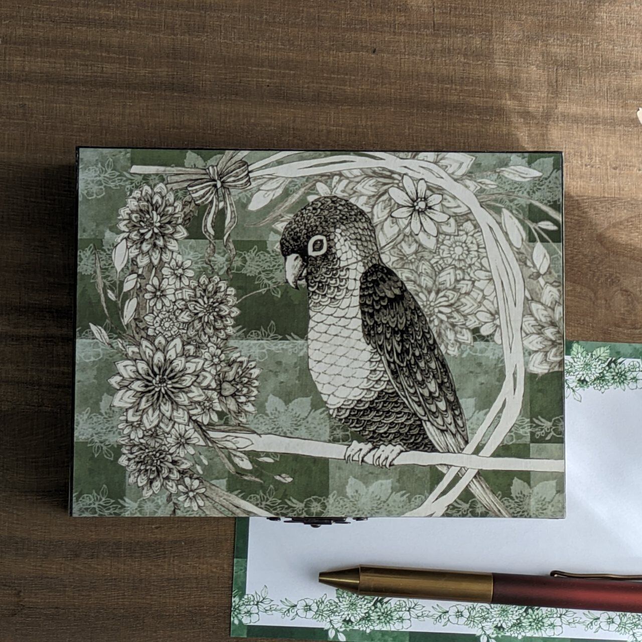 可愛く賢いウロコインコ柄のはがき箱。
