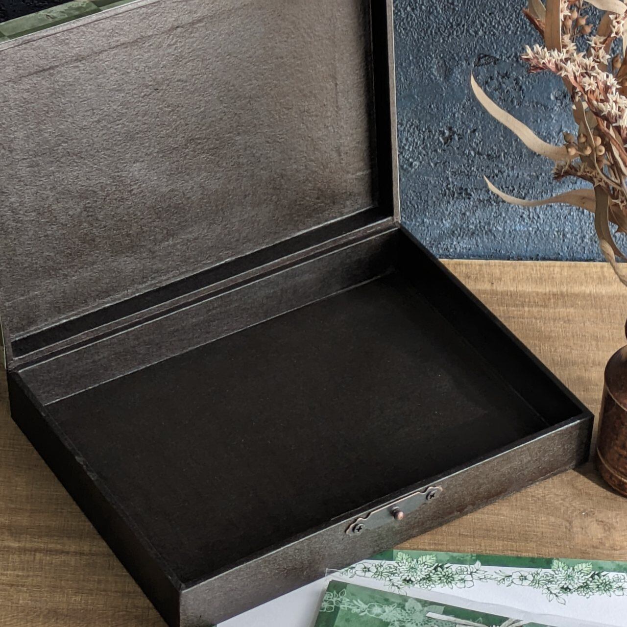 ポストカードがぴったり入る小さな箱。上品な黒色と繊細なイラストで彩られた小箱で、小さな宝物を収納するのに最適です。