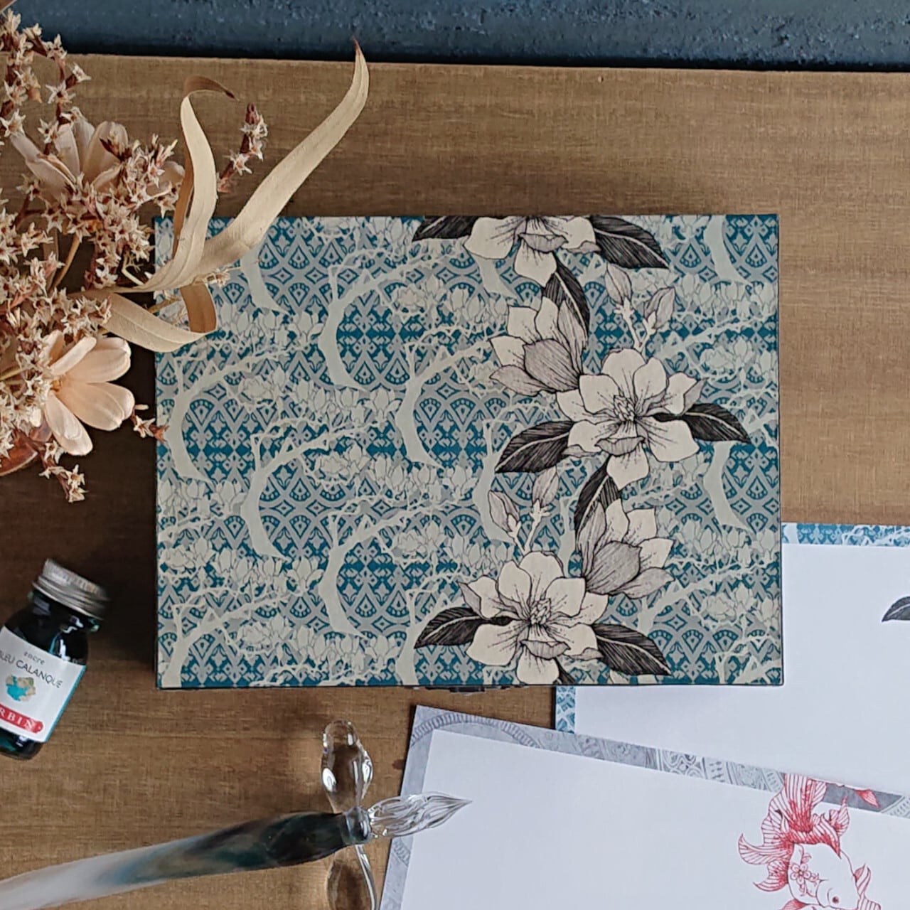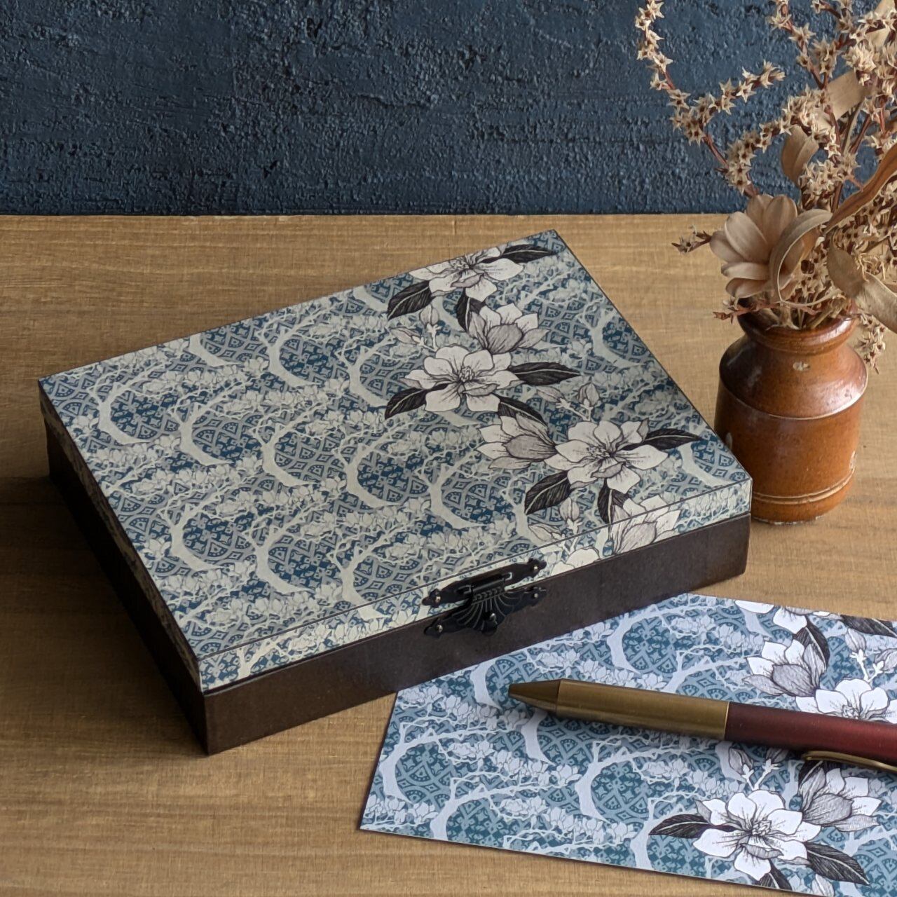 深い緑色に、華やかな木蓮が描かれたアンティーク調の風合いが魅力のはがき箱。